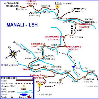 § It takes two days, normally with an overnight stop either in Kyelong (alt. 3096) or in tent accommodation in Sarchu (4253) or Pang (4500).
